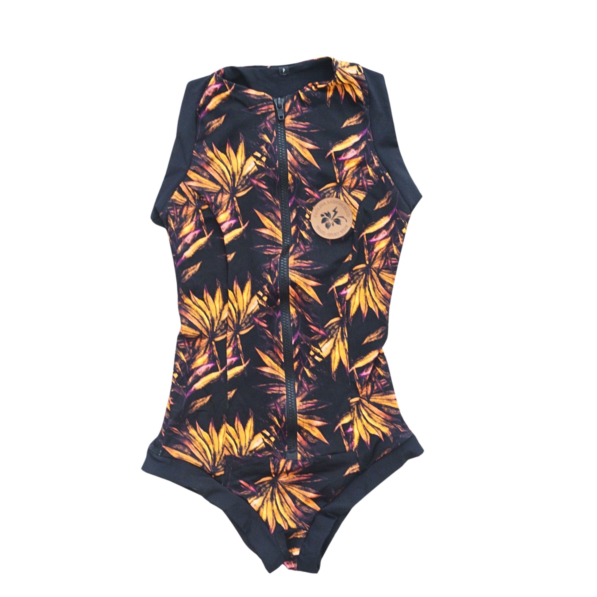 This sleek black one-piece features short sleeves and a smooth front zipper for an effortless fit, offering both comfort and flexibility. The bold design comes to life with large, vibrant pink flowers, adding a feminine and sophisticated touch.